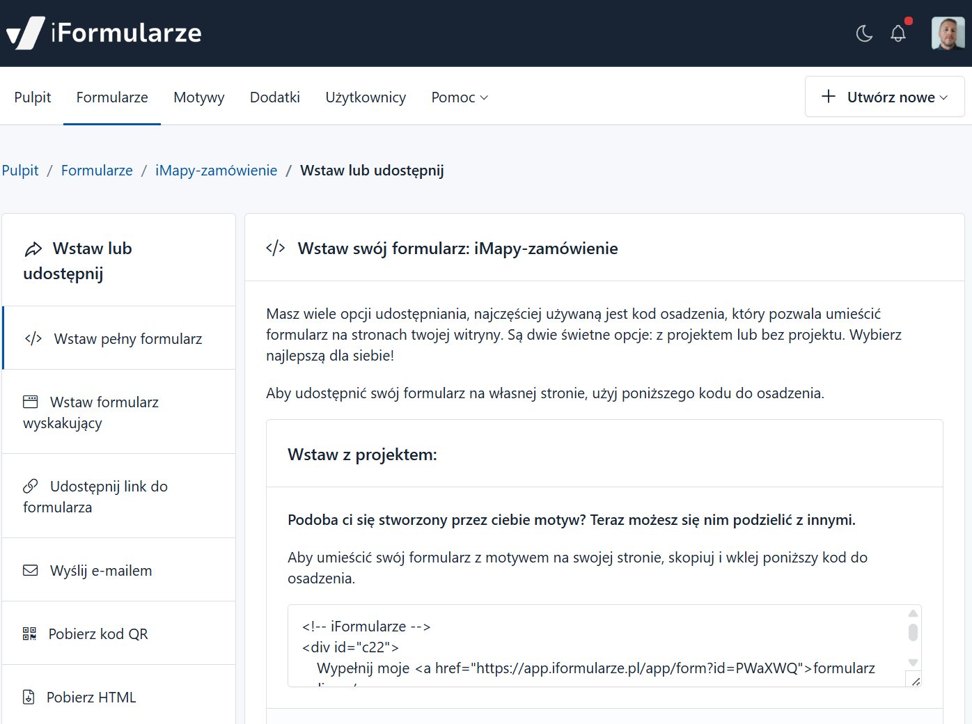 Udostępnij formularz linkiem, osadź na stronie internetowej (w treści lub jako wyskakujące okno).